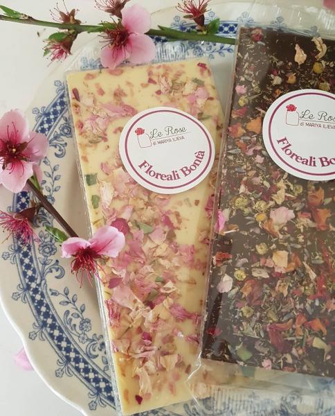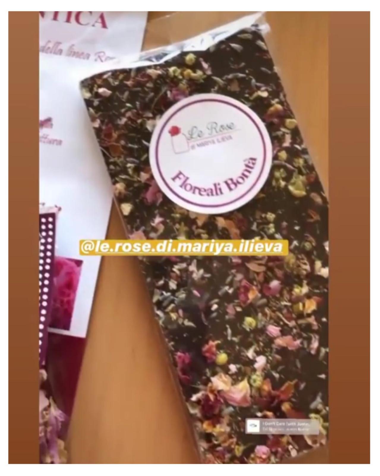 Delicato Cioccolato 55% fondente di grande qualità decorato con cura conpetali di rosa damascena in superficie.