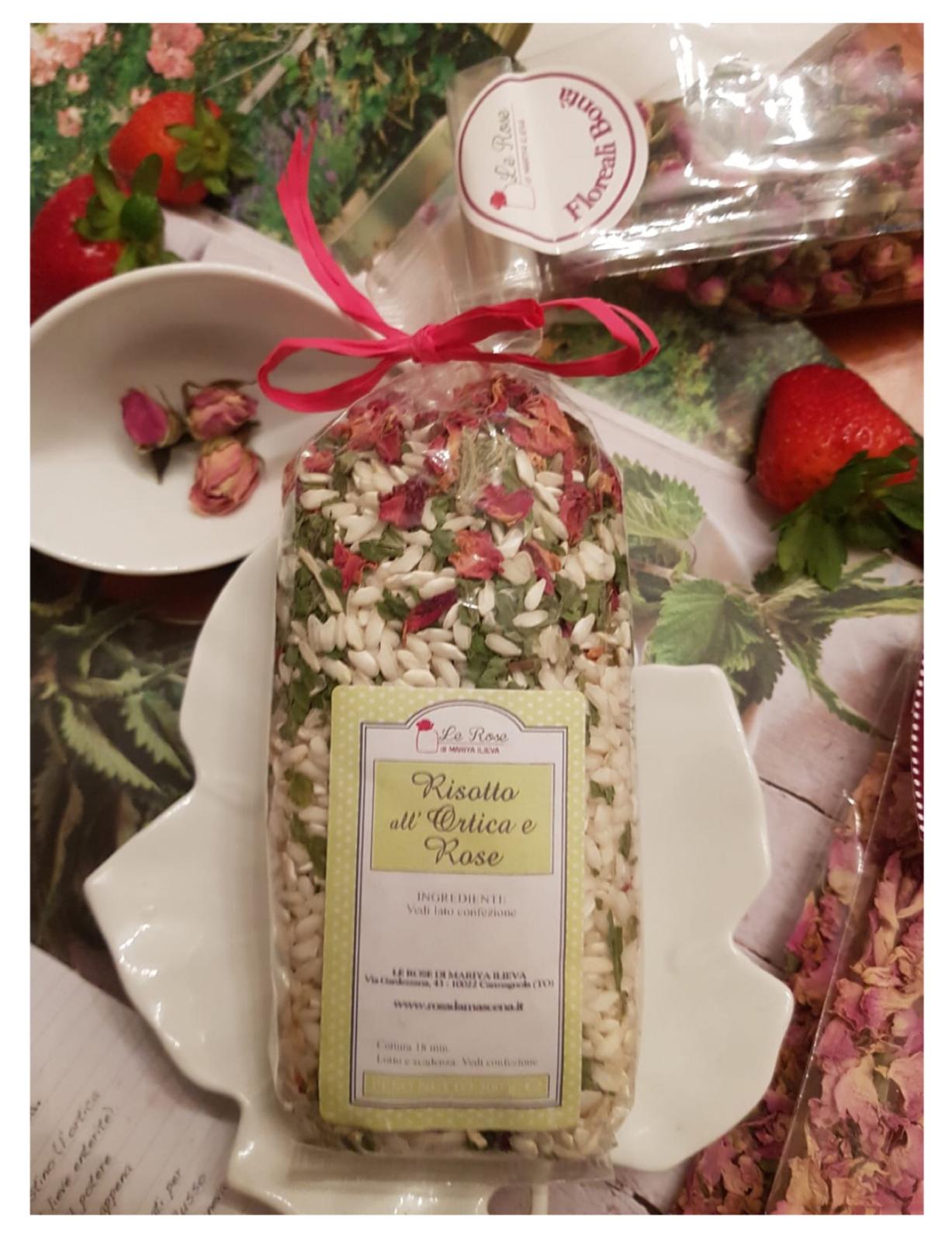 Riso Carnaroli italiano, la qualità più pregiata arrichito con Ortica e petali della Rosa Damascena per un primo piatto raffinato. Ottimo con aggiunta di gamberi a meta cottura, delicato solamente con brodo vegetale.